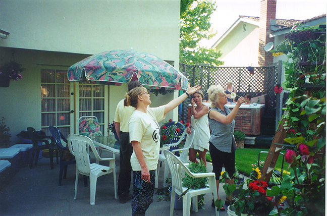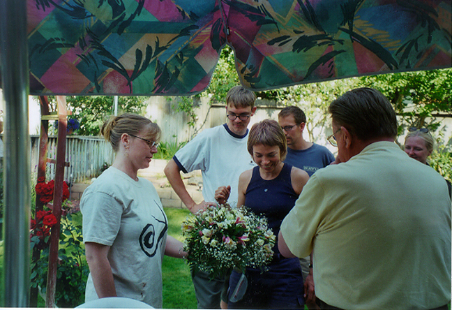 Directing the flower arrangements on the arch. |